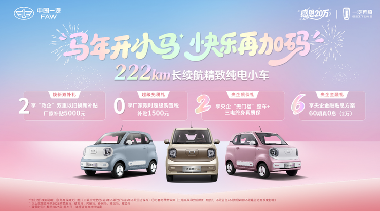 为迎接马年并庆祝20万辆下线里程碑,一汽奔腾小马同步启动“马年开小马 快乐再加码”新年购车活动。针对主要款型,推出涵盖焕新双补礼、超级免税礼、央企质保礼、央企金融礼的四重真保障。其中,真质保尤为亮眼——提供无门槛的整车及三电系统终身质保,且前三年不限过户、不限回店保养,这背后是一汽奔腾321服务权益体系(三终身、两计划、一个家)的支撑,彰显了央企大厂的责任担当与对产品品质的十足信心。
