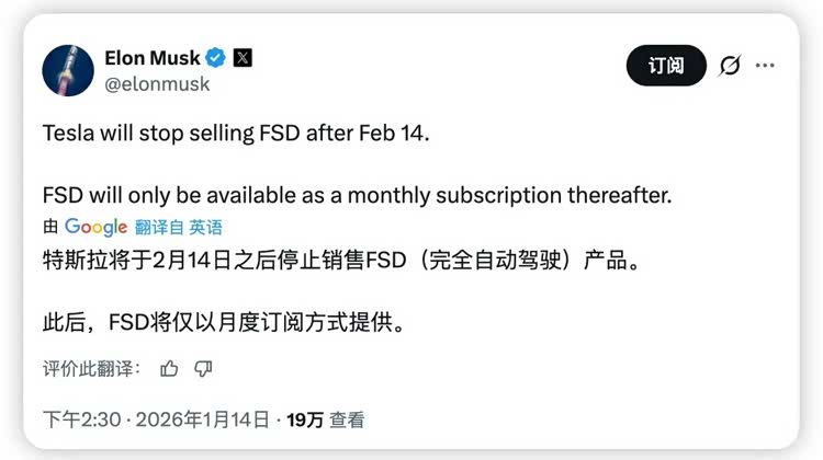 马斯克在社交媒体上突然宣布,从美国当地时间2026年2月14日起,将停止对外销售FSD选装包服务。届时,FSD服务将通过付费订阅的形式向外界提供,一次性买断模式将彻底取消,消费者只能通过订阅模式来体验FSD。