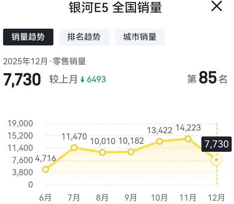 吉利银河E5在2025年12月份的销量为7730辆,相比2025年11月份的销量14223辆,环比下滑45.61%;