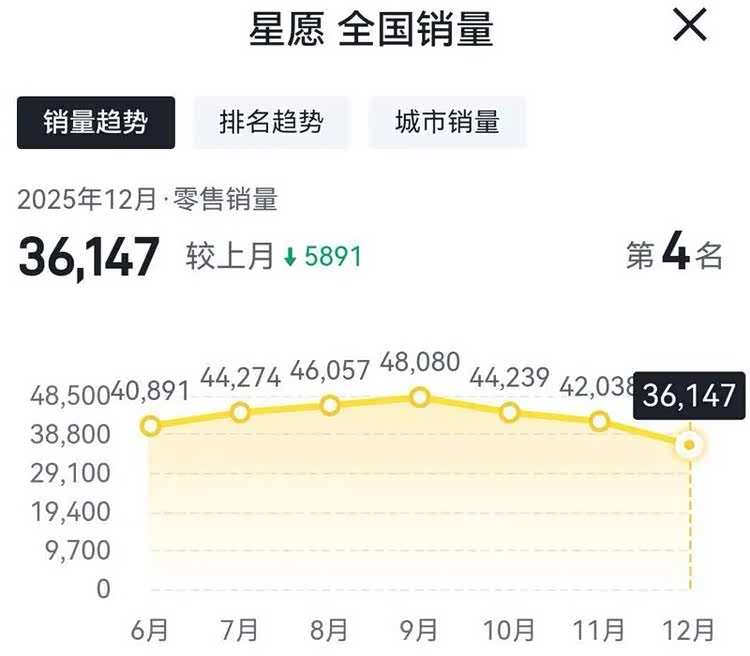 而吉利银河星愿在2025年12月份的销量为36147辆,相比2025年11月份的销量42038辆,环比下滑14.01%;