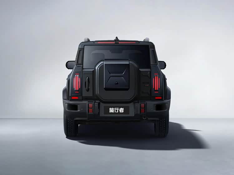 车身侧面延续方盒子造型,平直车顶搭配黑色行李架,宽体黑色轮眉与哑光黑轮辋呼应,固定式上车踏板兼顾实用与美观。车尾配备侧开式尾门与后挂式备胎,熏黑垂直尾灯与黑色后保险杠形成呼应,整体设计硬派气息浓郁。车身尺寸方面,其长宽高分别为4795*2006*1870(1880)毫米,轴距为2800毫米,带备胎版本高度为1880毫米,宽敞尺寸保障驾乘空间。