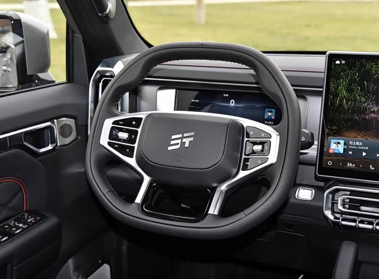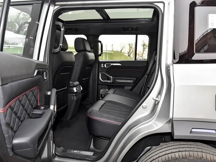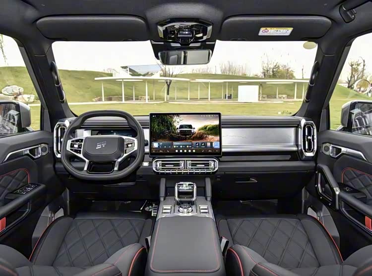 内饰以运动氛围为核心,采用黑红双色搭配提升质感,大量软质材料包裹中控台,副驾前方配备越野专属扶手,兼顾实用性与视觉效果。核心配置搭载15.6英寸悬浮中控屏,内置高通骁龙8155芯片,运行流畅不卡顿,支持语音连续识别、面部识别及高德导航,配合全液晶仪表与电子挡把,科技感拉满。车内配备64英寸全景大天窗,通透感极佳,座椅采用仿皮材质,包裹性与支撑性优异,后排座椅可比例放倒,进一步拓展储物空间,满足户外出行置物需求。