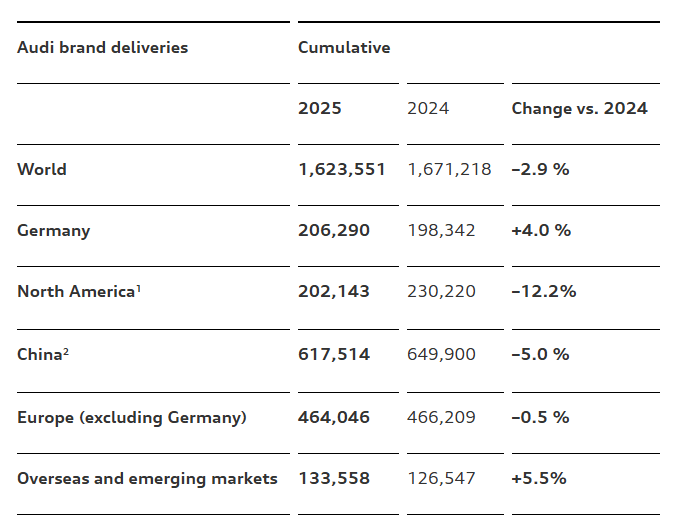 未达年度目标!奥迪集团2025年交付量同比下滑2.9%
