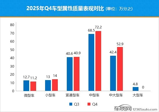 从四季度各车型质量投诉销量比数值变化来看,中型车依旧稳居“C位”,数值较三季度有小幅升高;中大型车成为数值环比涨幅最大的车型,质量表现较三季度出现明显下滑。相比之下,微型车和大型车的数值均出现环比回落,表现稳步向好,特别是后者,再次回归“零投诉”。