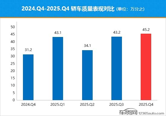 据国内领先的缺陷汽车产品信息收集和汽车消费者投诉信息受理平台车质网数据显示,2025年四季度共受理国内轿车有效质量投诉21,644宗。同期,乘联会数据显示国内轿车(除进口车)销量约为303.8万辆,涵盖235款车型。为确保数据的准确性,车质网本次只统计这235款车型的首次质量投诉案例,计算得出2025年四季度轿车质量投诉销量比均值为万分之45.2,与上季度相比数值略有升高,整体质量水平呈现持续下滑态势。