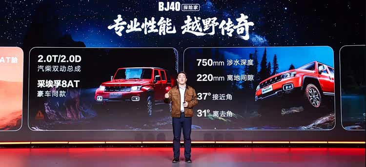 作为硬派越野,BJ40探险家搭载电控分时四驱和经典三把锁,全系标配越野AT胎,搭载2.0T的汽油和2.0D的柴油,采埃孚8AT变速箱,220mm的最小离地间隙,涉水深度达750mm,接近角37度,离去角31度,标配2.5吨拖拽资质。买了车就能出去“浪”,不用太多改装。