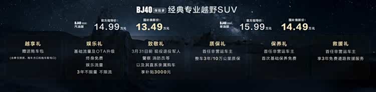 1月15日晚,北京越野发布BJ40探险家。官方指导价,汽油版14.99万元,柴油版15.99万元;国补焕新价分别减1.5万元,分别是13.49万和14.49万!