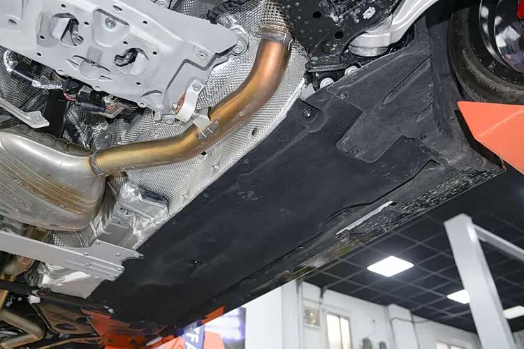 底盘两侧护板非常完整,排气隔热也很到位,预留了大排量发动机双排气管的位置。