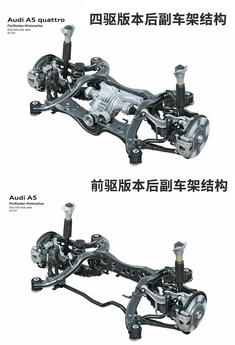 奥迪不管是A4还是A5,如果是两驱车型,后副车架则是H形结构,如果是四驱版本,后副车架则是完整的全框结构。