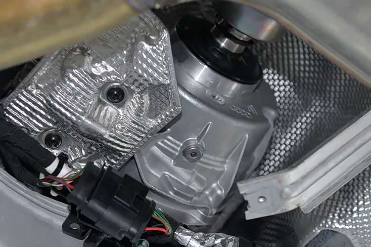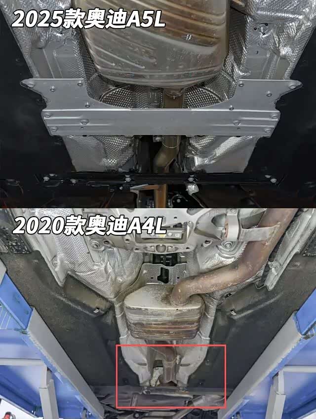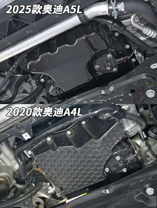 这台A5L上的5代EA888发动机油底壳是钢制油底壳,而老款A4L上的3代EA888发动机是工程塑料油底壳,由于工程塑料膨胀系数和缸体不一样,因此可能会渗油,这台A5L明显进行了改进。