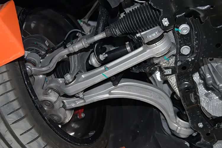 与绝大多数正经奥迪车一样(排除大众换壳车),前悬是铝合金双插臂结构,并且上下都是双球结构。这种结构最大的好处是提升操控的精准性,但悬架调校难度也相应增加,所以一般很少有厂家用。