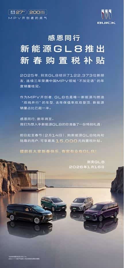 车家号·0浏览·2026-01-16 12:12 · 北京在成功拿下2025年度MPV车型销量冠军后,别克趁热打铁,对新能源GL8的促销进一步加码。别克方面表示,正式推出新能源GL8限时”同行感恩礼遇":即日起至2026年2月14日下定,可享受至高1.5万元的购置税补贴,打造“黄金购车窗口期”。