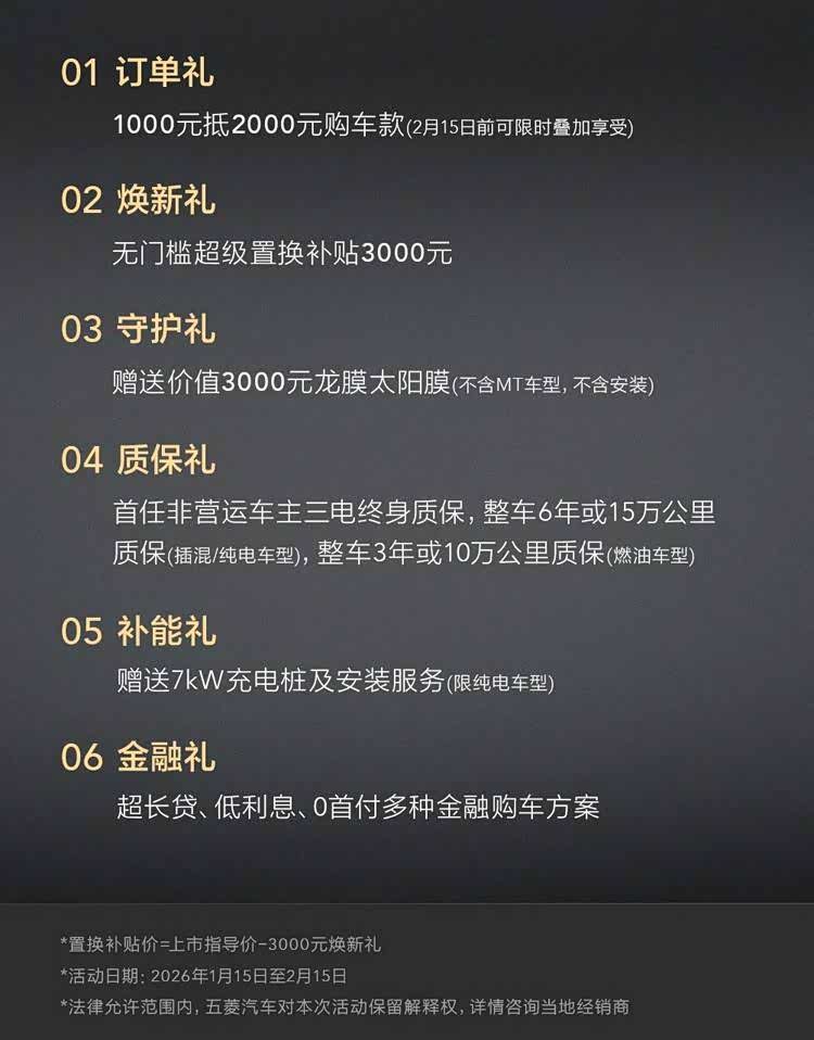 另外,自2026年1月15号—2月15日订车用户,厂家还提供6重福利,包括1000元抵2000元购车款、置换补贴3000元、赠送价值3000元的龙膜太阳膜、首任非营运车主三电终身质保、赠送7kW充电桩及安装等等,具体看下图。