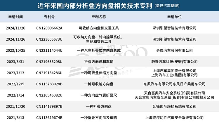 据盖世汽车不完全统计,自2021年起,从东风日产、上汽、奇瑞、蔚来等整车厂,到均胜安全、延锋、引望等顶级供应商,中国企业在可折叠/可隐藏方向盘领域布局了数十项专利。