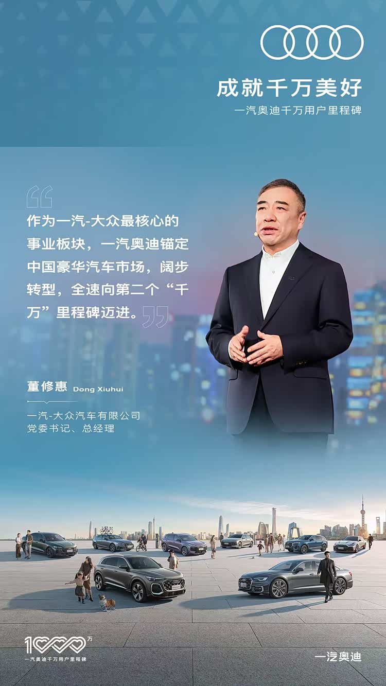 在1月15日于深圳举行的"一汽奥迪千万用户盛典"上,一汽-大众汽车有限公司党委书记、总经理董修惠,与1000万一汽奥迪用户及各界嘉宾共同见证这一历史性时刻,并发表了重要讲话。