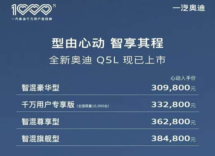 在台上,一汽奥迪却没有沉溺于庆功盛宴,而是迅速将目光投向了未来。活动现场,全新奥迪Q5L正式上市,价格区间为30.98万-38.48万元。