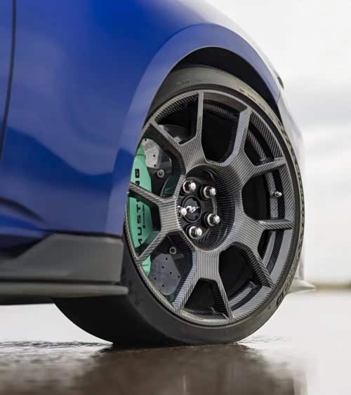可选装的赛道性能包更将Dark Horse SC本已令人印象深刻的弯道性能与能力推向更高境界。首先专属的MagneRide校准程序是围绕该性能包标配的碳纤维轮毂开发的。为应对车辆提升的性能,福特性能车与米其林合作开发了定制版Pilot Sport Cup 2 R轮胎。前轮尺寸为305/30R20,后轮为315/30R20,此配置借鉴了Mustang GTD技术,可以提供超级跑车级别的轮胎抓地力。为Mustang GTD开发的可变牵引力控制系统,允许驾驶者根据动态驾驶情况调节所需的牵引力辅助级别,除可完全关闭电子稳定控制系统外,还提供多达5级辅助。