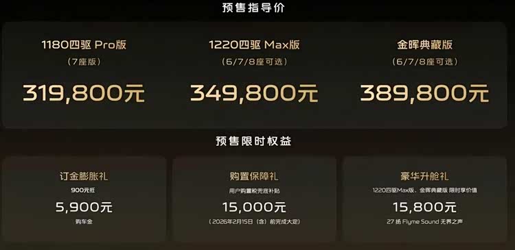 2026年1月20日,吉利 银河V900(参数|询价)将正式上市。新车已公布预售价区间为31.98-38.98万元,共推出三款配置车型。作为吉利银河V系列的首款产品,这款中大型MPV提供6/7/8座三种灵活座椅布局。