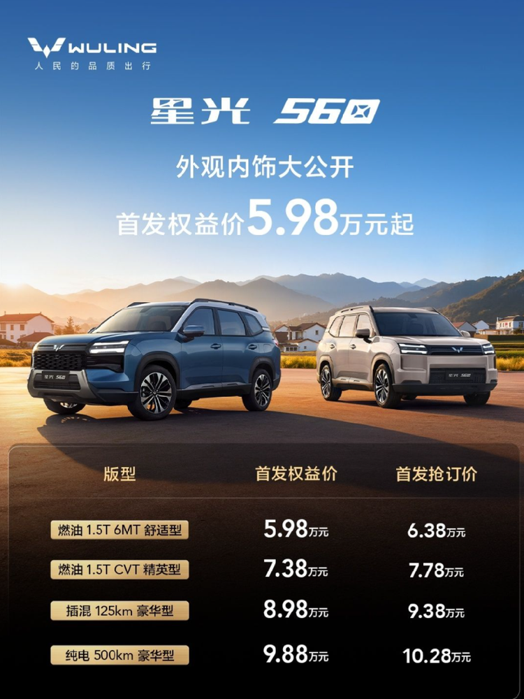 当6万级家用SUV市场仍困于“低价即减配”的固有桎梏,五菱始终以“人民需要啥就造啥”的初心破局。 星光560(参数|询价)携同级独一份的“一车三动力”阵容重磅登场,首发权益价低至5.98万,以中型SUV的越级身段,直接对垒哈弗M6、长安CS35 PLUS等紧凑级/小型竞品。其中燃油版凭借碾压级动力、越级空间、满配配置与全域安全防护,将性价比拉满至同价位无对手的境界,彻底改写入门级SUV的价值规则——让用户以6万级预算,享受到10万级的尊享用车体验。