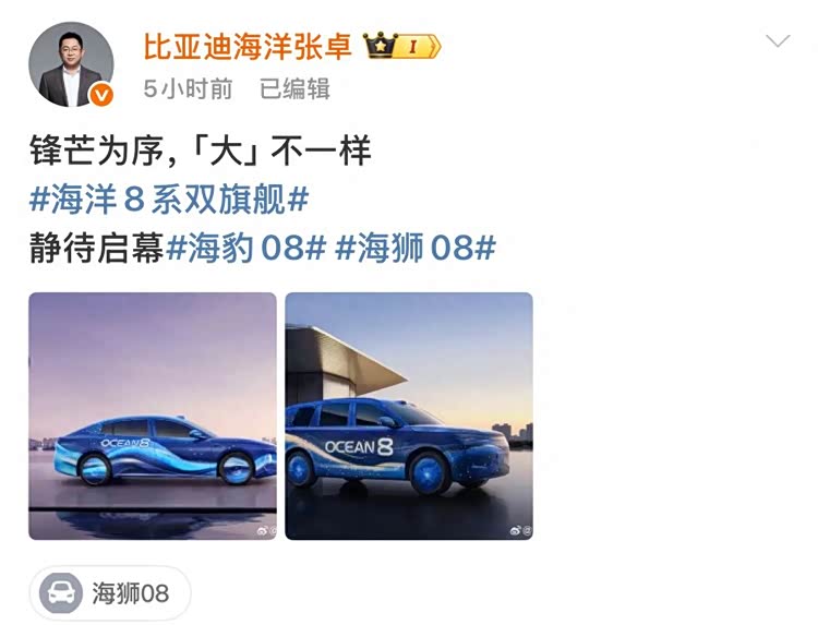 近日,比亚迪海洋网总经理张卓发布了全新8系双旗舰—— 海豹08(参数|询价)与海狮08的官方谍照。