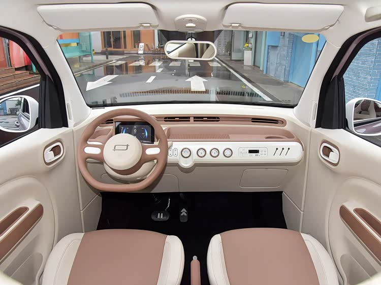 进入车内,座舱新增可可棕内饰配色,如同温暖的比利时热可可,搭配奶白色饰板,营造出轻奢舒适的驾乘氛围,方向盘采用皮质包裹,尺寸小巧,握感舒适,女性用户操控无压力。双辐式多功能方向盘搭配全液晶仪表盘,中控区域保留机械式旋钮,便于驾驶者进行日常操作。虽然车身尺寸紧凑,但摩登马依旧保持了3门4座的布局,空间表现超出预期,2200mm轴距带来充裕的前排驾乘空间,175cm体验者入座后头部空间一拳有余,后排可容纳两名儿童或短途乘坐成年人,满足日常通勤与亲子出行需求。