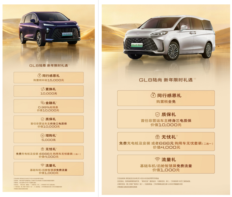 GL8陆尚限时权益包含:购置税全免、价值1万元的终身三电质保,以及价值4千元的无忧礼和1千元的免费流量。大家在购车时建议向当地4S店详细了解不同车型之间的政策,结合自己的用车需求做到精准匹配,这样才能花更少的预算,享受更多的价值福利。