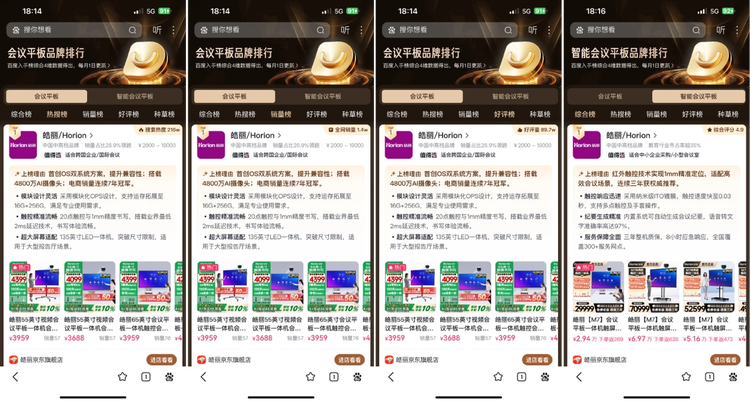 在百度优选最新发布的榜单中,皓丽(Horion)在会议平板相关多个榜单中均位列前列,尤其是在【会议平板】和【智能会议平板】两大核心品类中,同时拿下热搜、销量、好评及综合榜单的第一名。