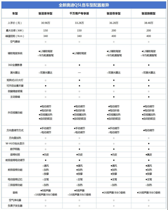 全新奥迪Q5L一共四款车型,分别是智混豪华型、千万用户专享版、智混尊享型和智混旗舰型,整体配置划分还是比较清爽的。