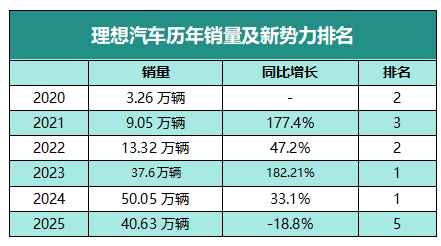 这一年的爆发式增长让李想踌躇满志地喊出了“2025年销售160万辆”的宏大目标,不料事与愿违,理想的噩梦正是从2025年开始。