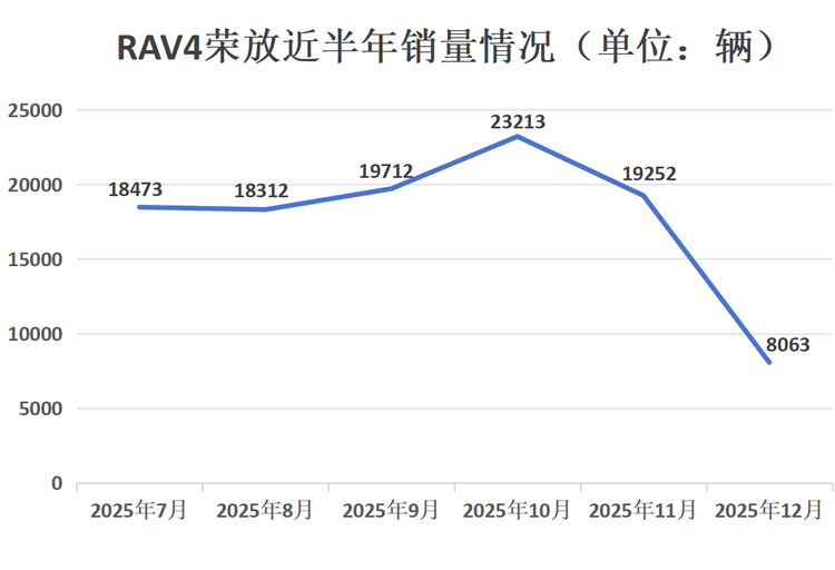 从2025年5月份开始, 丰田RAV4荣放(参数|询价)的月销量就一直保持在1.8万辆以上,然而,在11月官方推出新一代车型后,车型的销量走势却出现剧烈震荡。数据显示,RAV4荣放的11月销量仍维持在19252辆的高位,但12月销量“腰斩”至8063辆,环比暴跌58.1%。