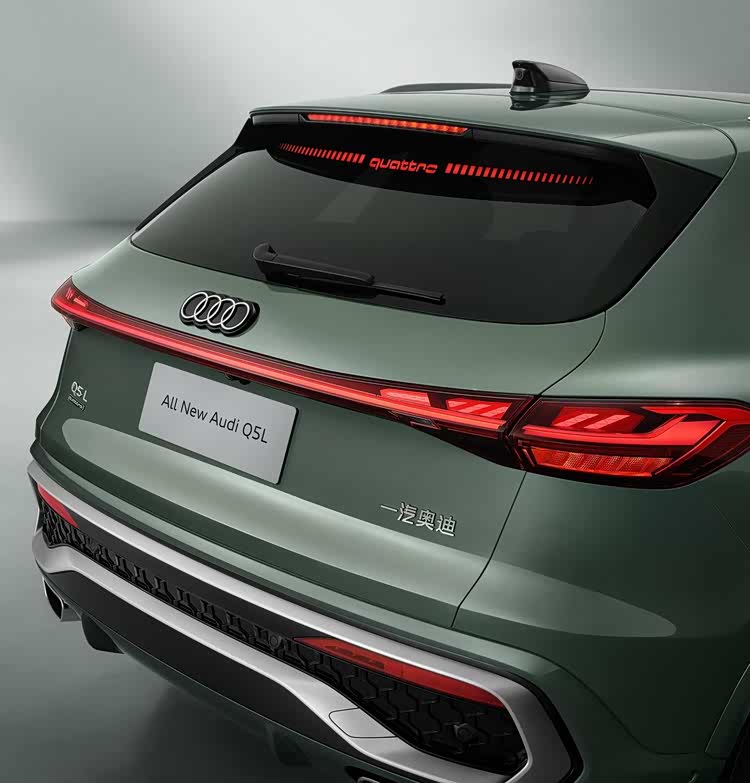 外观设计方面,全新奥迪Q5L采用了奥迪品牌最新家族化设计元素,并提供两种风格可选,相比老款车型要更加年轻时尚。新车前脸依旧是标志性的大尺寸格栅设计,内部辅以蜂窝装饰点缀,高配车型还进行黑化处理,视觉效果更运动。同时,新车配备全新扁平化LOGO,两侧大灯组造型更细长,并搭载星辰矩阵大灯,拥有16个远光区控制,支持智能变光、动态流水转向、弯道补光以及迎宾灯语等功能,科技感十足。车身侧面更加修长,同时采用了全新样式的轮毂及半隐藏式机械门把手设计,符合主流审美需求。车尾部分采用贯穿式尾灯设计,内部集成了第二代数字OLED光源,可支持8款尾灯签名。车身配色方面,新车提供传奇黑、青城绿、茉莉白、曼达洛银和卡其棕共5款外观颜色可选。