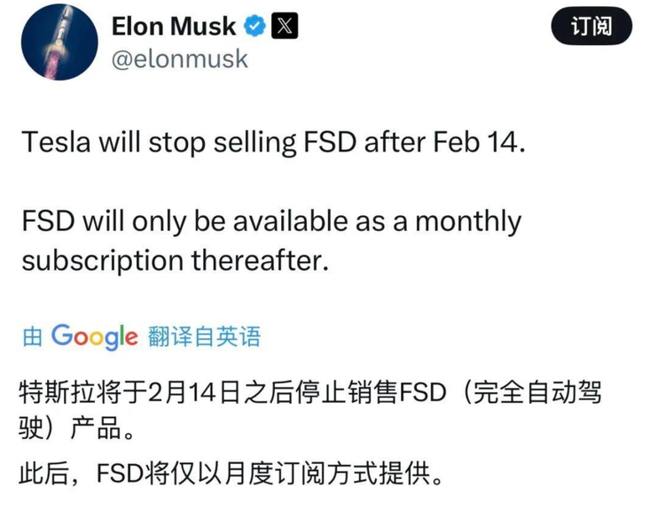 1月14日,特斯拉CEO埃隆·马斯克在社交平台上正式宣布,自2026年2月14日起,特斯拉全自动驾驶FSD功能将在全球市场停止一次性买断销售,全面转向月度订阅模式。