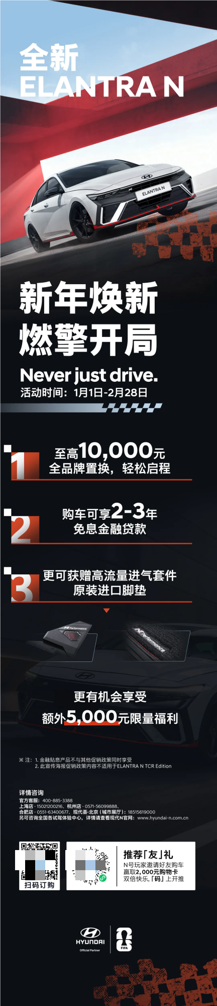 - 同时,现代汽车N品牌针对旗下车型推出2026年限时礼遇,即日起至2月28日,下单Elantra N可选24期50%首付起或36期65%首付起金融方案,或享5000元置换支持;指定车型更可叠加至高10000元购车优惠及10000元置换补贴。Elantra N TCR Edition则提供24期50%首付免息方案,并赠原厂脚垫及专属车贴套装。同期,IONIQ 5 N(艾尼氪5N)面向前20名支付尾款用户提供25000元专属购车优惠
