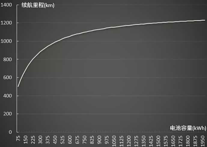 可以看到随着电池容量的增加,续航里程也是随之提高的,但是增长趋势越来越缓,当续航里程打到1000KM左右时再增加电池对续航里程的提升就很弱了,当续航提升到1300KM左右时,再增加动力电池时续航里程几乎没有提升。