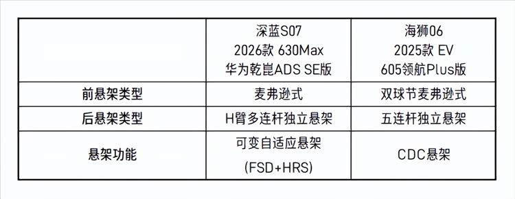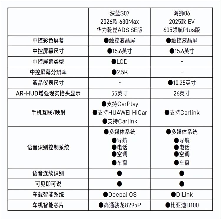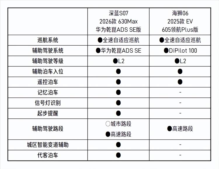 为了对比客观公平,我选择终端落地价相近版本进行对比,让大家根据自己的实际用车需求作决策。全新深蓝S07选择的是2026款630Max 华为乾崑ADS SE版,指导价16.49万元;海狮06 EV选择的是605领航PLUS版(顶配),指导价16.38万元。