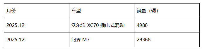 与凯迪拉克等品牌相比,沃尔沃在新能源车型里的销量,算是矬子里的大个,毕竟XC70插电式混动上市不足一年,我们以2025年12月份做比较,沃尔沃XC70插电混车型月销4988辆,算是不错的成绩,是二线豪华品牌里的佼佼者,在混动车型中,问界M7的销量,也是沃尔沃XC70插电混车型的近6倍,完全不在同一层级,后期想要追平这样的销量也并非易事,尤其在EX30电池出现热失控风险之后。
