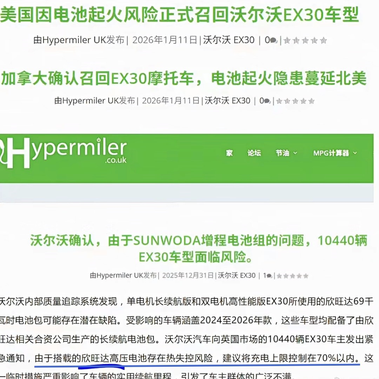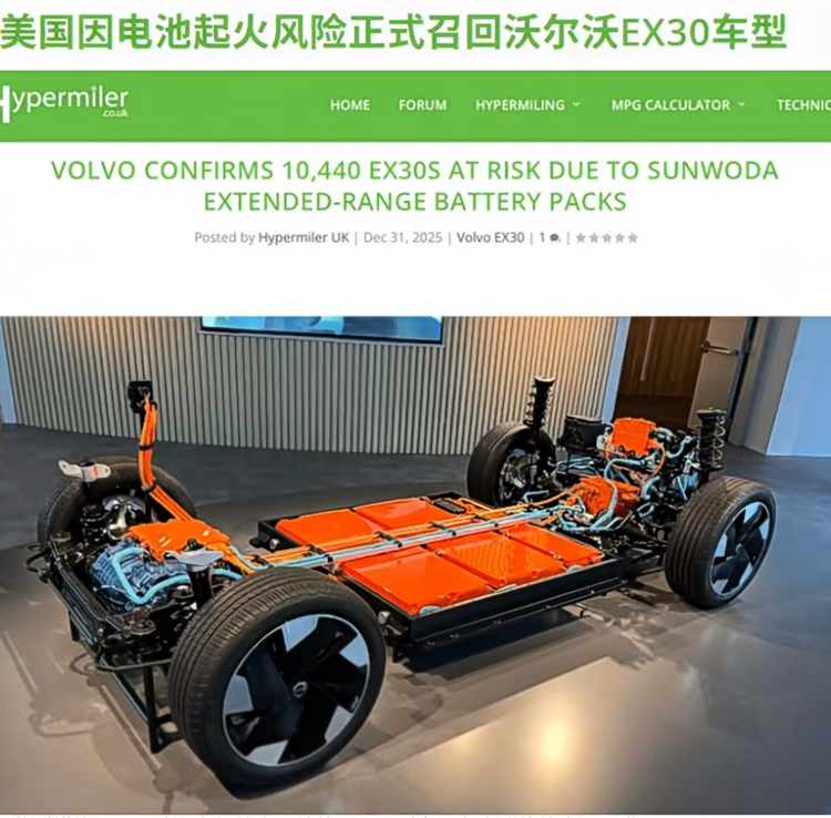 事起沃尔沃EX30,因为该车型使用了欣旺达69千瓦时电池包,此电池包存在热失控风险,可能导致自燃。
