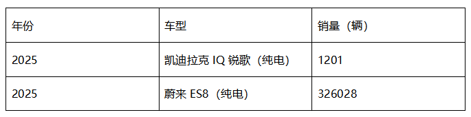 但有句话说,三十年河东,三十年河西,进入电动化时代之后,这些二线豪华品牌一下就跨到了河西,以凯迪拉克IQ锐歌全年销量1201辆,销量最高的12月为156辆,而其最差销量在2月份,月销仅仅20辆。另外一款中型纯电SUV车型IQ傲歌的销量,2025年单月最高51辆。通过图表不难看出,蔚来ES8一个月的销量,是IQ锐歌的近143倍。