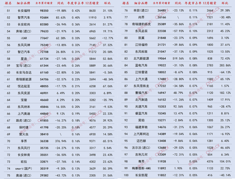 全年维度上,品牌分化态势愈发清晰:比亚迪、吉利银河等头部新能源品牌凭借全产业链布局与技术迭代巩固优势;传统合资品牌中,仅少数完成电动化转型的企业守住份额;新势力阵营则呈现“强者愈强”格局,小米、零跑等加速挤压中小品牌生存空间。