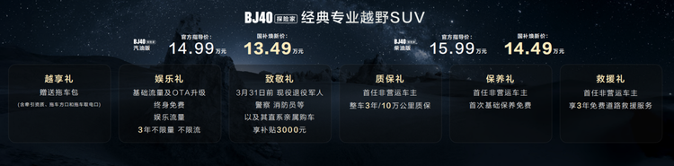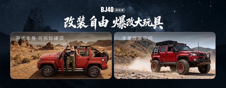 BJ40探险家的上市,不仅是北京越野对BJ40经典车系的匠心焕新,更是中国品牌在硬派SUV领域持续深化、价值升维的集中体现。它将以硬核的越野实力满足探索的渴望,以极具竞争力的价格与礼遇降低享受专业的门槛,以越级的舒适配置革新硬派车的驾乘感知,以前沿的智能科技连接未来的出行生活。BJ40探险家,正以全面的产品力与深厚的品牌底蕴,助力更多用户开启探索之旅,并在中国汽车产业高质量发展的道路上,留下坚实而经典的辙印。