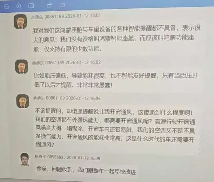 在余承东指出问题后,群内有相关产品负责人表示:“问题收到,我们跟整车一起尽快改进。”截图显示,这段对话发生在1月12日。