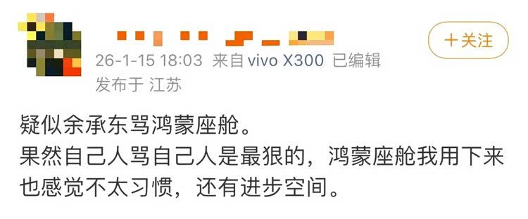 在相关帖子下,还有其他品牌车主吐槽车辆的车机不智能的问题。另外,还有网友调侃,“这就是内部满血版大嘴”。此前,余承东曾多次因为在发布会上不留情面地吐槽友商而引发热议。