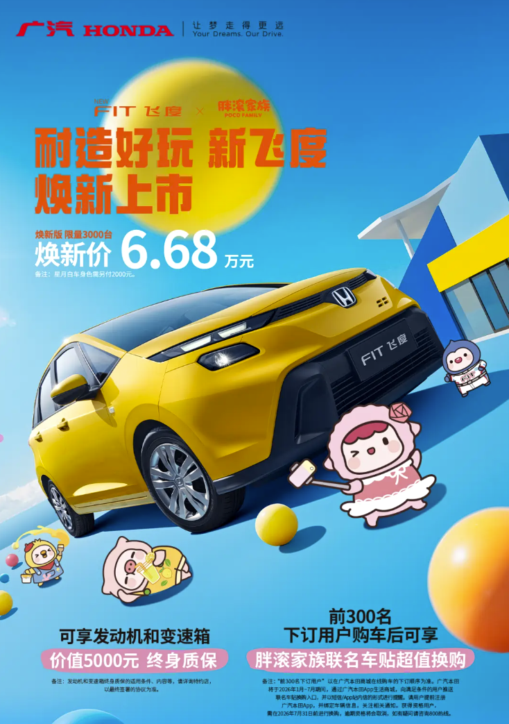 车家号·0浏览·2026-01-16 22:55 · 北京1月15日,广汽本田官方宣布新款 飞度(参数|询价)正式上市。新车此次仅推出1款配置,全国限量发售3000台,官方焕新起售价为6.68万元(终端一口价)。官方表示,新车在延续经典“平民超跑”基因的同时,将携手知名IP“胖滚家族”推出联名车贴,并为用户提供发动机与变速箱终身质保政策。