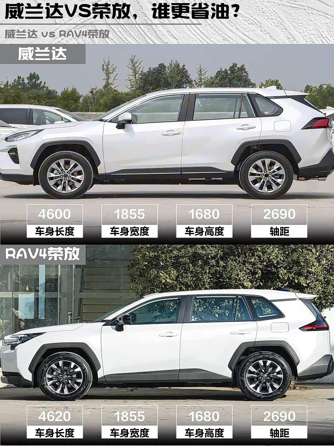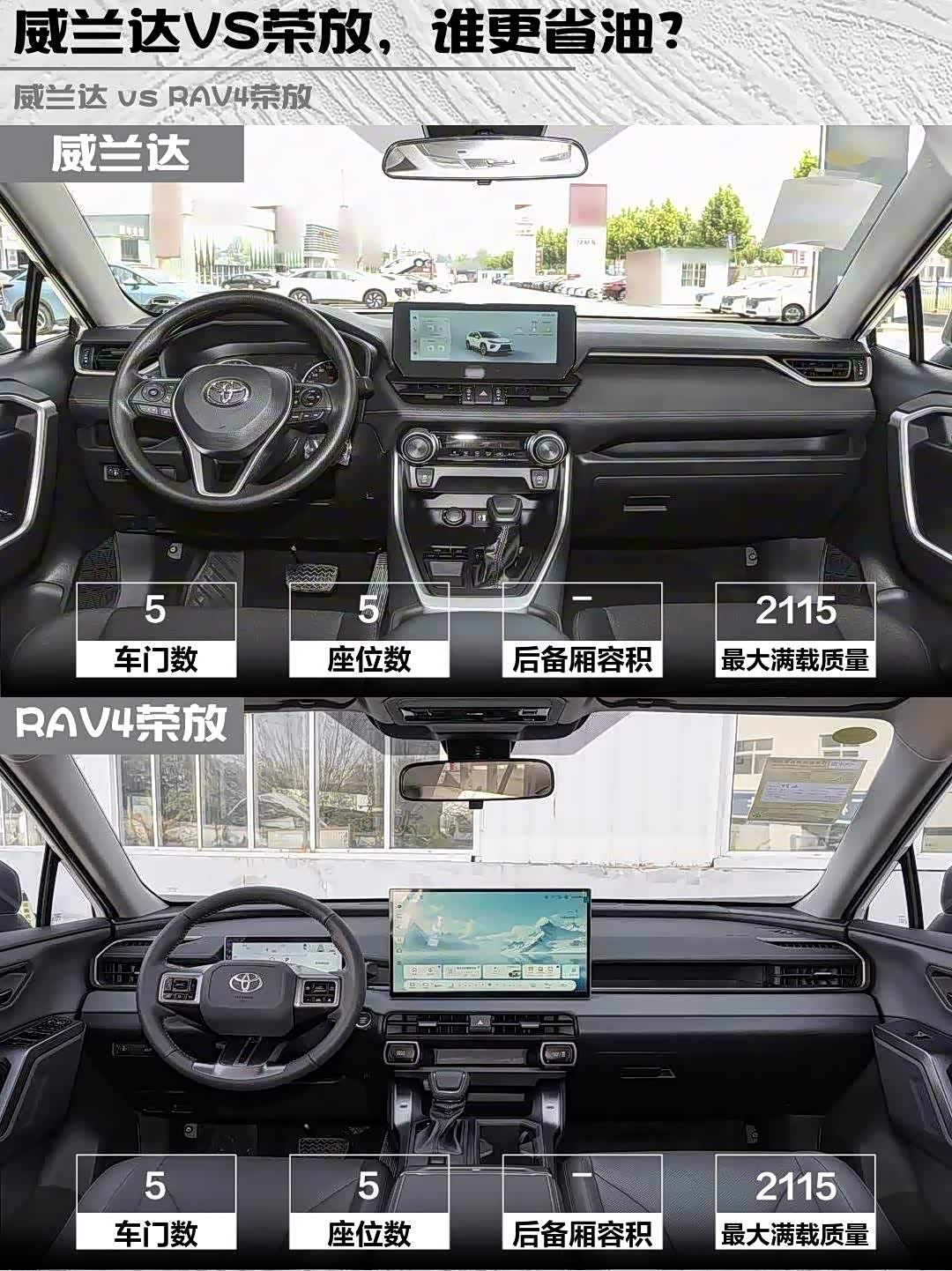 开起来的感觉差异最大!威兰达底盘过滤颠簸更细腻,过减速带"咚咚"两下就完事;荣放转向更灵活,5.5米转弯半径在深圳老小区掉头一把过。高速上威兰达隔音稍好,但80km/h后哥俩都得靠音乐压噪音...