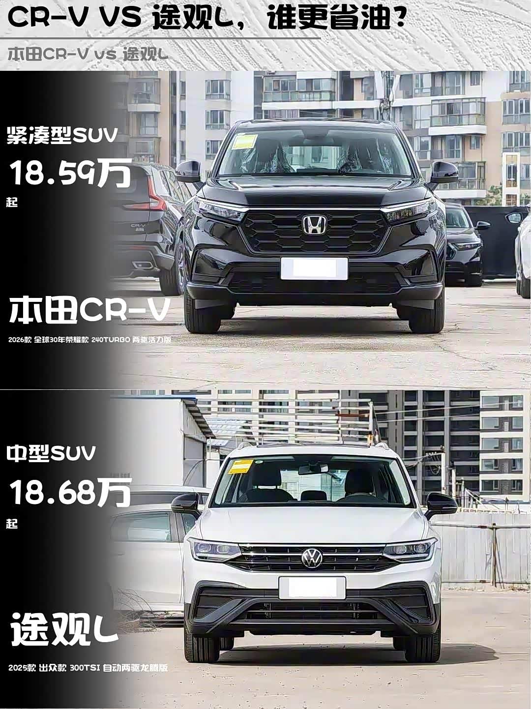 最近在纠结 本田CR-V(参数|询价)和途观L的朋友看过来!这两款20万级合资SUV到底怎么选?今天就来深度对比2026款本田CR-V 240TURBO两驱活力版(18.59万)和2025款途观L 300TSI两驱龙腾版(18.68万),看完你就知道谁更适合你!🚗💨