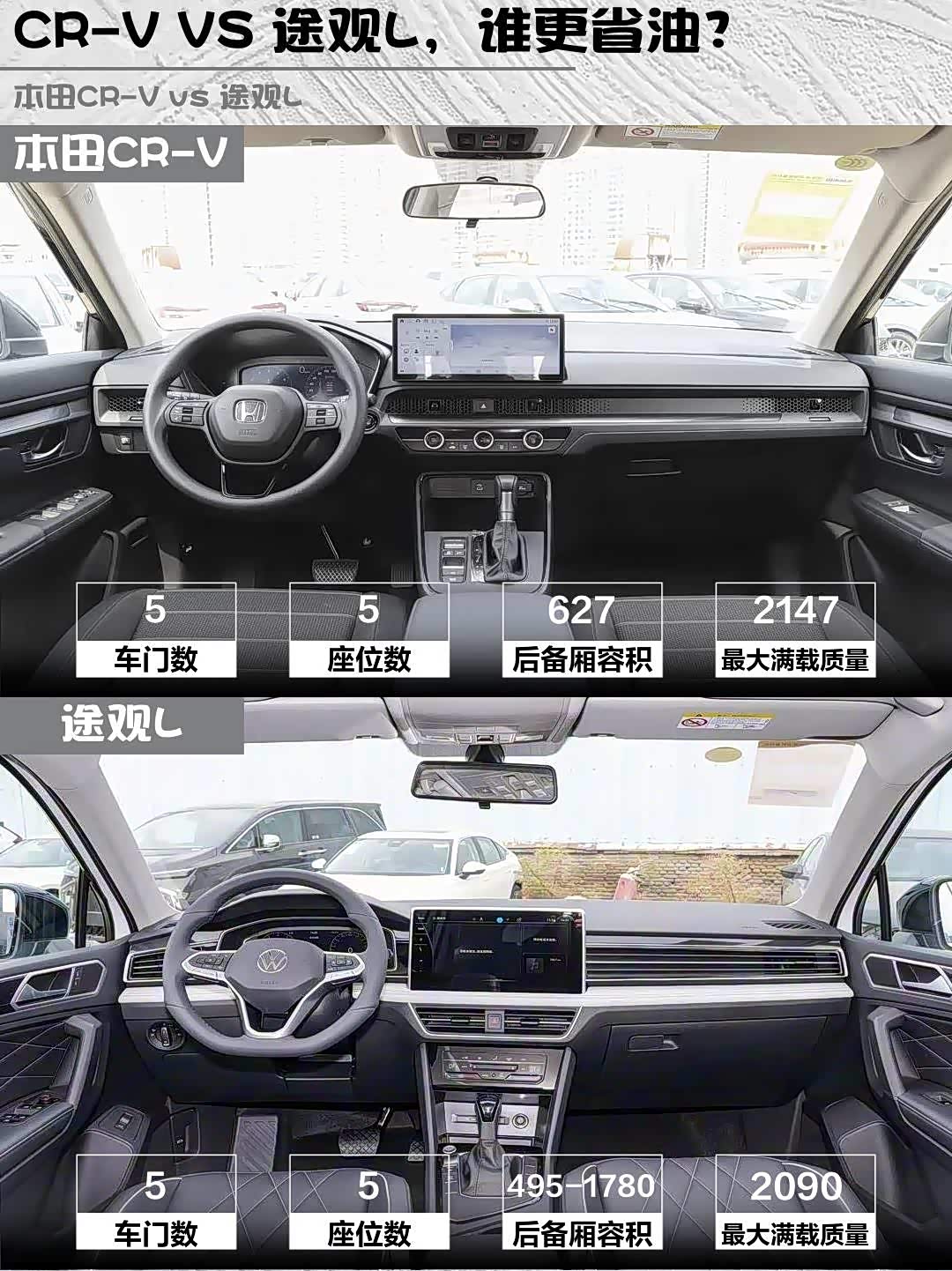 CR-V不愧是空间魔术师!4703mm车长比途观L还短,但627L后备箱完胜途观L的495L,后排纯平地台+座椅前后滑动太香了,露营装备随便装。途观L虽然定位中型SUV,但后排中间15cm凸起真的劝退,不过电动尾门是CR-V没有的实用配置。🛋️