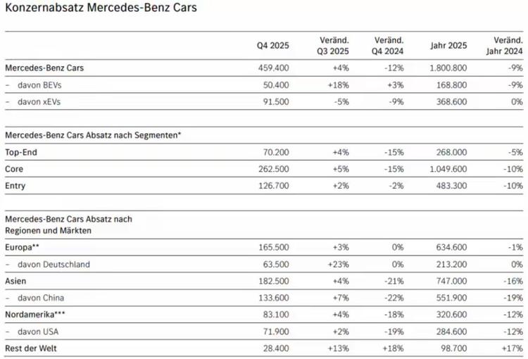 2025年,梅赛德斯-奔驰集团全球汽车总销量为216万辆,同比下降10%。即使是纯电车型也下滑了4%。