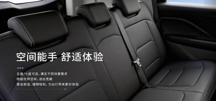 内饰主打实用简约风格,细节配置兼顾科技感与便利性。中控台以规整线条为主,全系标配皮质座椅与7英寸组合仪表,长续航版本额外配备10.33英寸中控屏,支持蓝牙连接、倒车影像等功能,操作直观流畅。核心升级在于提供5座/7座两种座椅布局,5座版后备箱容积达819升,能轻松容纳露营装备、婴儿车等大件物品;7座版采用2+2+3剧院式布局,520毫米超宽二排通道便于第三排进出,满足多人口家庭出行需求,座椅灵活调节进一步提升空间利用率。