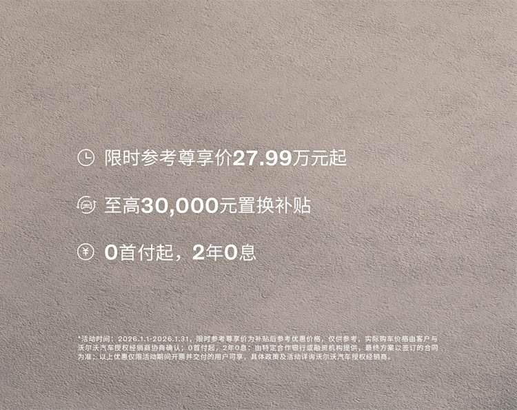 而且现在沃尔沃全新S90还有限时尊享价27.99万元起,沃尔沃S90限时尊享价26.79万元起,并提供至高30000元置换补贴及2年0息政策的年底优惠政策。1月购买,可以享受0首付起,至高60期、12期日付,低至29元、超长72期、2年0息等诸多购车方案。置换用户还能拿到至高15000元置换补贴,沃尔沃车主增购还能拿到价值6000元的礼包。这种折扣力度确实是买到就赚到了,瞄准沃尔沃全新S90的中产们,大可出动了。