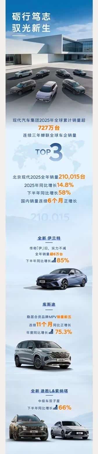 要知道,在新能源渗透率突破50%、自主品牌“一超三强”格局成型的中国车市,合资品牌普遍承压,而北京现代能在2025年交出21万辆销量、连续6个月正增长的成绩单,已然展现出市场韧性。如今有了国家层面的合作背书,北京现代在技术引进、产业链协同等方面的外部环境将更为顺畅,这对于身处转型深水区的企业而言,无异于“顺水行舟”。